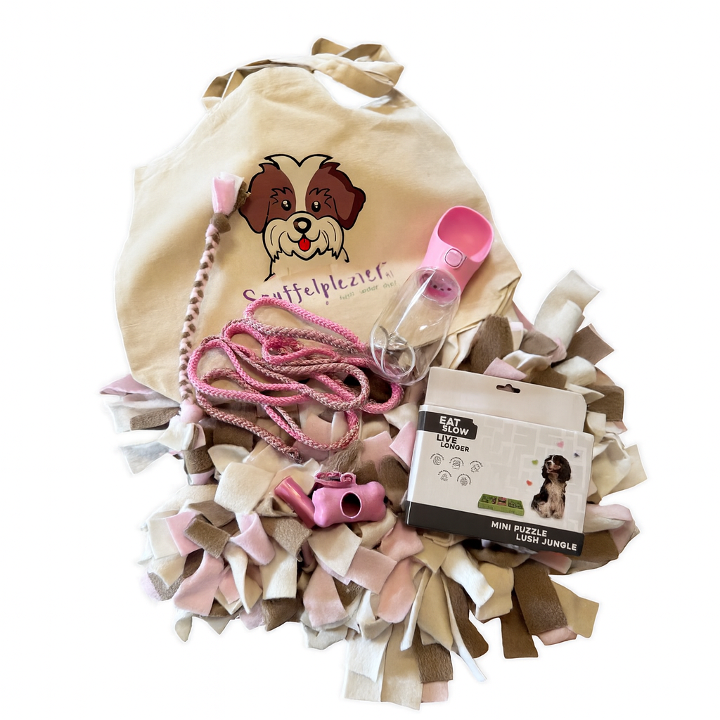 Must haves voor de start van mooie samenwerking en benodigdheden. Met in de tas een snuffelkussen, een lussenlijn, een drinkfles, een snuffelspelletje, een fleece speeltouw en een poepzakjeshouder met vulling.